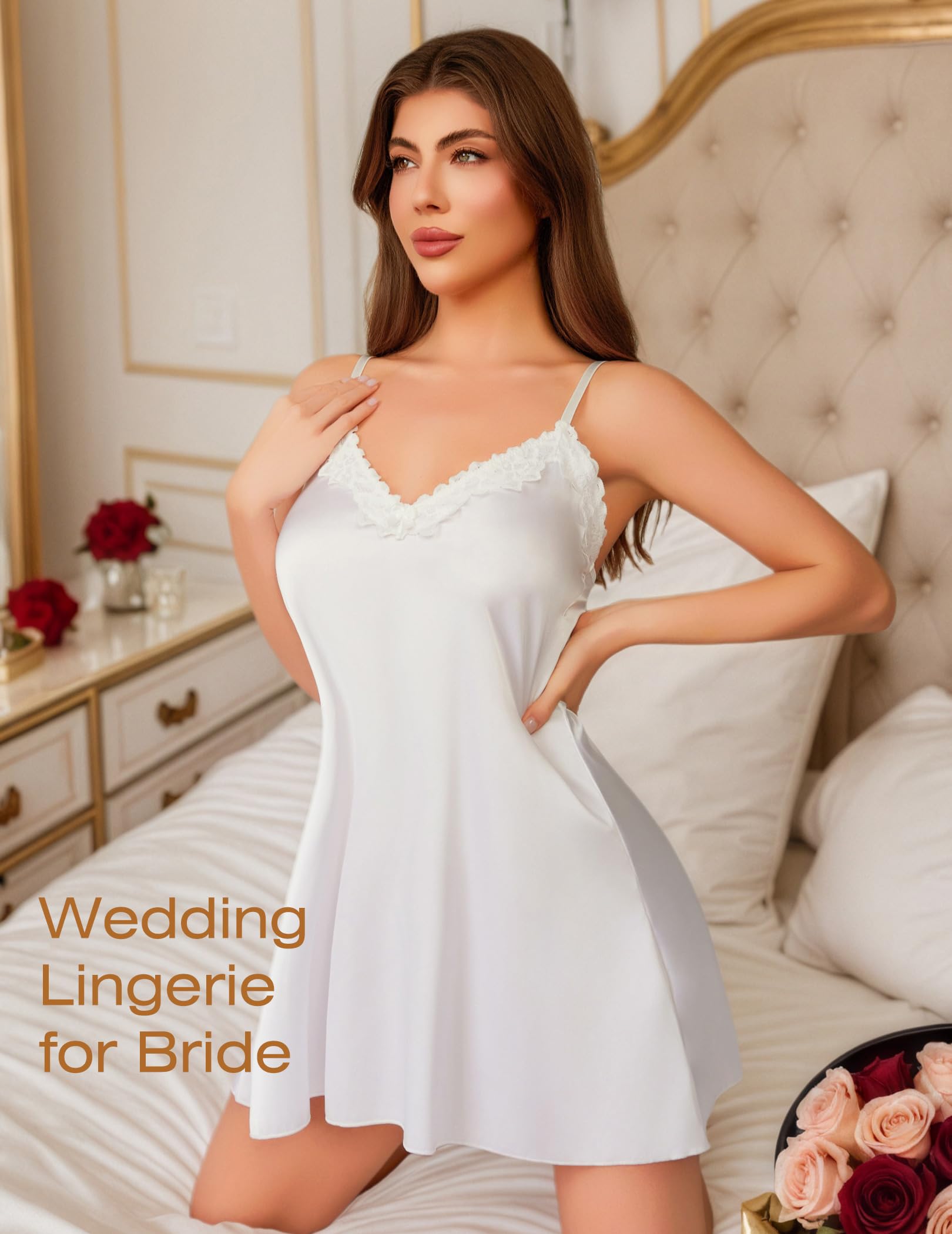 - Romantic Lace for Special Nights:Make every night unforgettable. The lace V-neck and glossy satin drape add a touch of elegance and sensuality. This sexy lingerie highlights your curves beautifully — ideal for date nights, anniversaries, or when you just want to feel stunning
