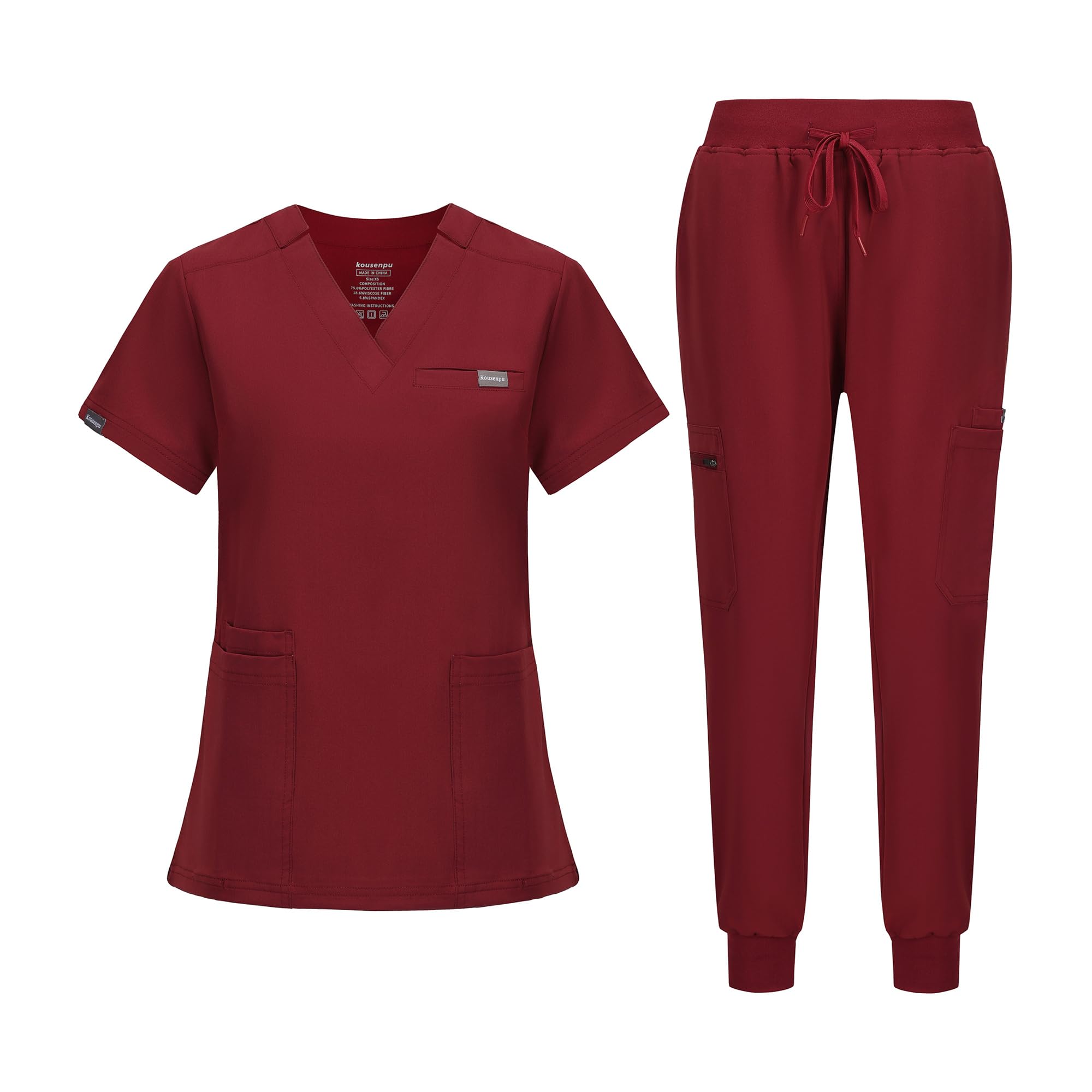 Kousenpu Scrubs for Women Set,V-Neck Stretch Scrubs Top & Jogger Pants Set,Medical Workwear for Nurses Women and Man (Burgundy, Medium)