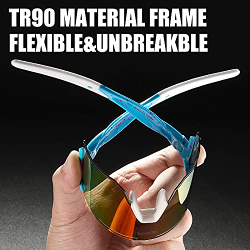 - 【Stress-Resistant TR90 Frame】All frames are made of lightweight and durable TR90 material, even if you wear it for a long time, you will not feel discomfort and tired. This cycling sunglasses are made of lighter materials and can be hung on the waist, making it more convenient to use.