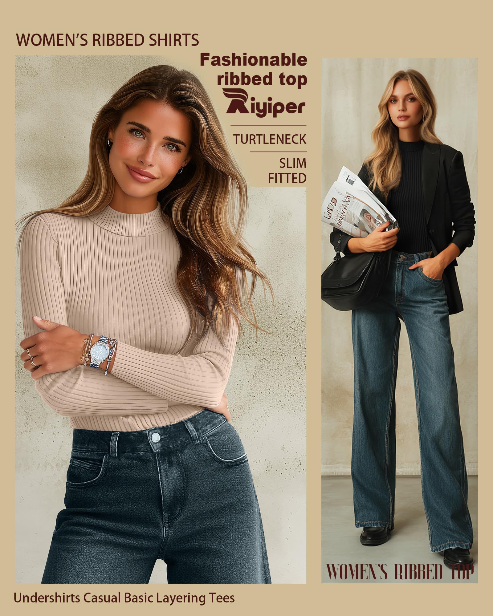 Riyiper 3 Pack Women’s Ribbed Shirts, Mock Turtleneck Long Sleeve Tops Slim Fitted Undershirts Casual Basic Layering Tees(Black, White, Cream,Large)
